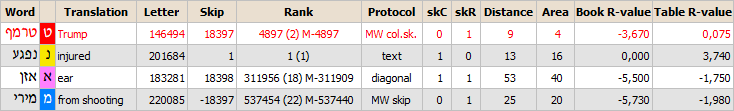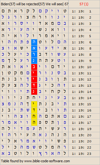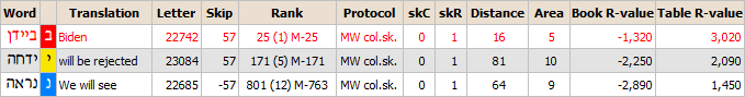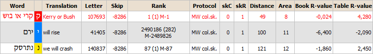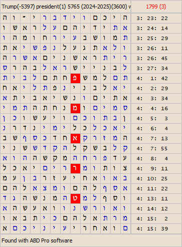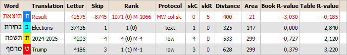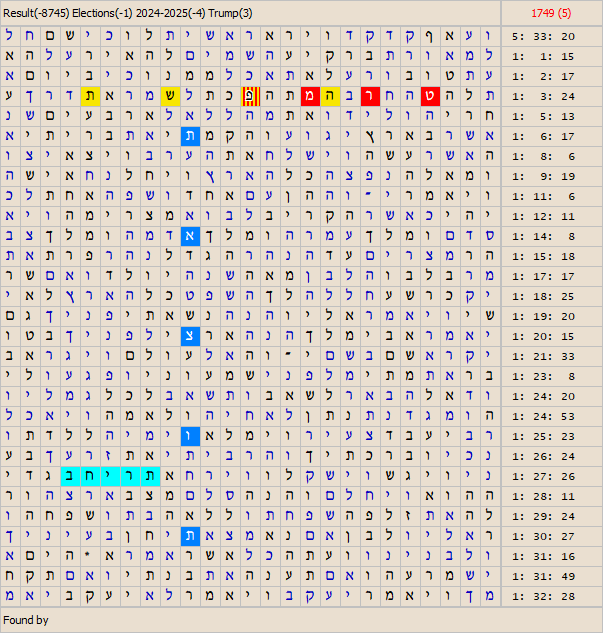 The masterword of the matrix is : Result The slavewords of the matrix are : Elections, 5785 (2024-2025), Trump The odds can be estimated to be less than 2:100 (based on 1,000 generated control texts) Wikipedia: 2024 United States elections