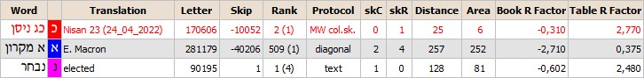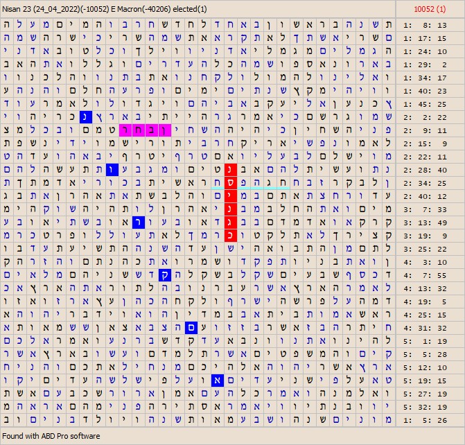 The masterword of the matrix is : 2022, 24 April The slavewords of the matrix are : E. Macron, elected, Passover Wikipedia: Macron