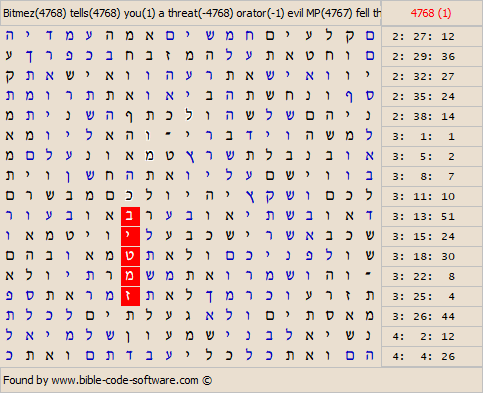 The masterword of the matrix is : Bitmez The slavewords of the matrix are : tells, you, a threat, orator, evil MP, fell there, enemy, you will die, from the heart The odds can be estimated to be less than 1:10,000 (based on 100,000 generated control texts) The table also includes the expression : "anger of Hashem" (not mentionned above). Context: Representing the Felicity (Saadet) Party, Bitmez delivered his speech during a debate on Turkey’s 2024 Foreign Affairs budget. He fiercely criticized the AKP government for continuing trade and normal relations with Israel, while publicly condemning it during the Gaza war. Holding a banner reading “Murderer Israel; collaborator AKP,” he declared: “You are Israel’s accomplices” and accused the ruling party of contributing to “every bomb Israel drops on Gaza.” He insisted: “We can perhaps hide from our conscience, but not from history,” warning that Israel would suffer divine retribution. His final words were: “You will not escape the wrath of Allah. I salute you all.” Immediately after, he collapsed at the lectern. Bitmez suffered a heart attack (Ankara City Hospital). He passed away on December 14, 2023, two days after collapsing and just one day before his 54th birthday. His death also led to the loss of the parliamentary group of the alliance he was part of, as it no longer met the required minimum number of deputies. Wikipedia: Hasan Bitmez